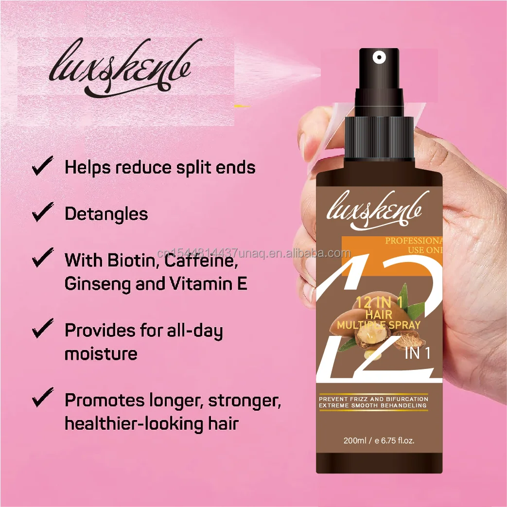 Product DescriptionCustom Logo 12 in 1 Hair Multiple Usage Spray Leave in Treatment Anti-Frizz & Split End for Damaged Dry Hair Professional