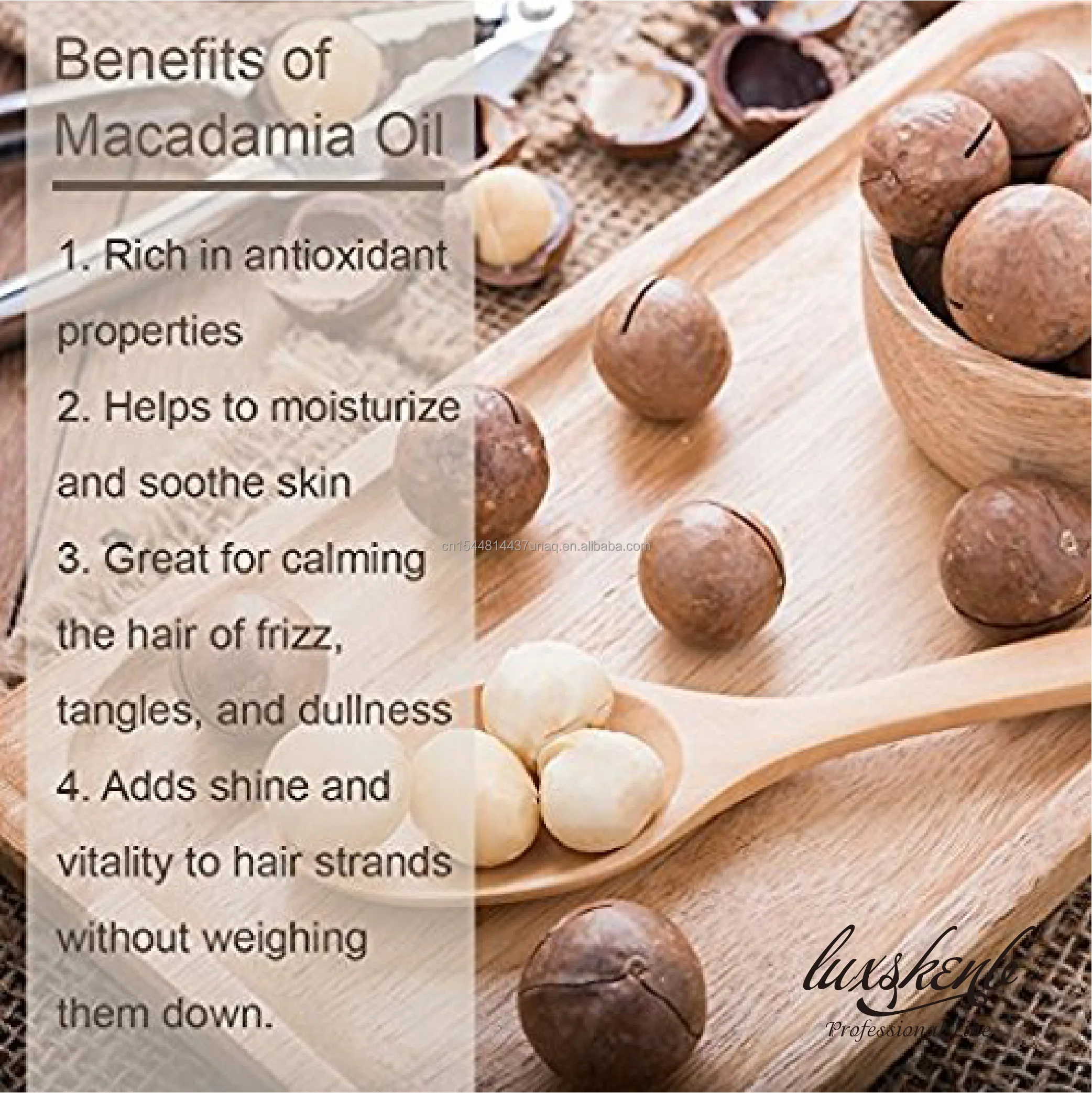 Benefits | Macadamia oil is rich in potent antioxidants such as mono-unsaturated fatty acids, flavonoids and tocopherol. It is also rich in palmitoleic and oleic acids, which offer cells antioxidation properties. It re-deposits essential fatty acids necessary for the strength and vitality of human hair, in addition to preventing damage to the outer cuticle layer during daily hair styling by lubricating the hair